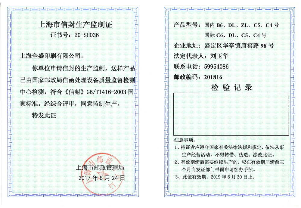 上海市信封生产监制证